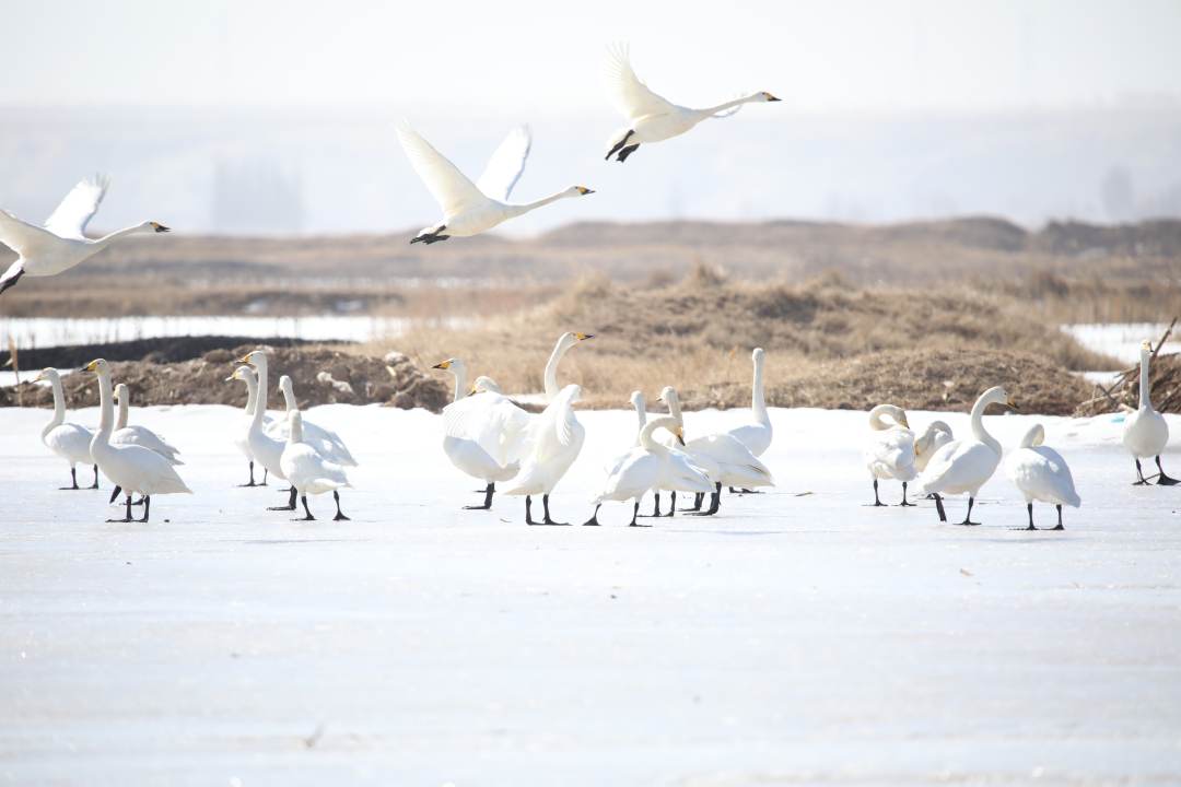在黄河内蒙古巴彦淖尔乌拉特前旗先锋镇李虎段的黄河滩头上,大片的冰雪已经消融,广阔的水面上迎来了今春第一批“客人”天鹅。阳春三月,天气乍暖还寒,但这并不影响这些洁白的水上精灵在水中悠闲嬉戏。它们有的将头栽入水中,捕食水里的虾和水草,有的昂起修长的脖颈在水面上引吭高歌,有的站立水面上翩翩起舞,有的则在天空中展翅翱翔,它们与黄河形成一道靓丽的生态景观,为初春的黄河带来勃勃生机,也让这片水域变成了美丽和谐的“天鹅湖”。