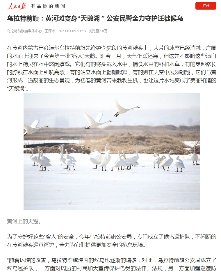 为了守护好这些“客人”的安全,今年乌拉特前旗公安局,专门成立了候鸟巡护队,不间断的在黄河滩头巡查巡护,全力为它们提供更加安全的栖息环境。