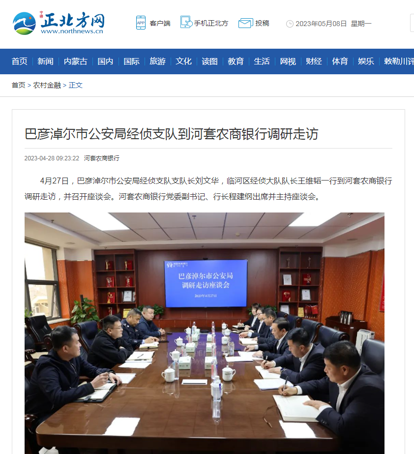 4月27日,巴彦淖尔市公安局经侦支队支队长刘文华,临河区经侦大队队长王维韬一行到河套农商银行调研走访,并召开座谈会。河套农商银行党委副书记、行长程建纲出席并主持座谈会。