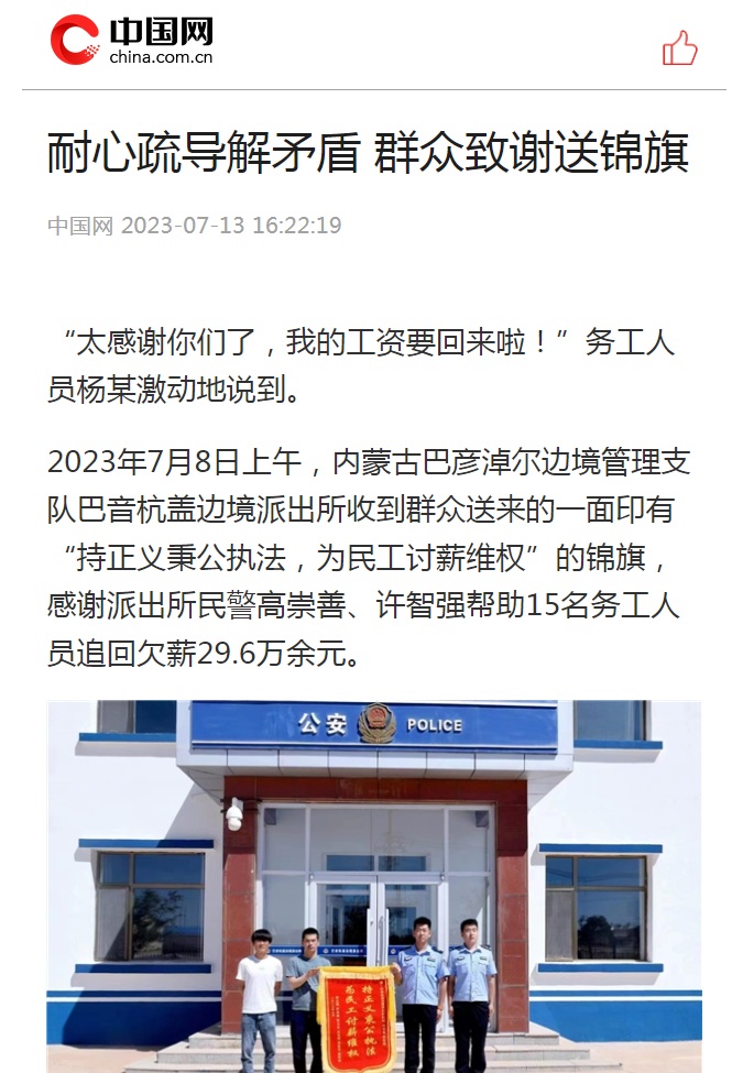 2023年7月8日上午,内蒙古巴彦淖尔边境管理支队巴音杭盖边境派出所收到群众送来的一面印有“持正义秉公执法,为民工讨薪维权”的锦旗,感谢派出所民警高崇善、许智强帮助15名务工人员追回欠薪29.6万余元。
