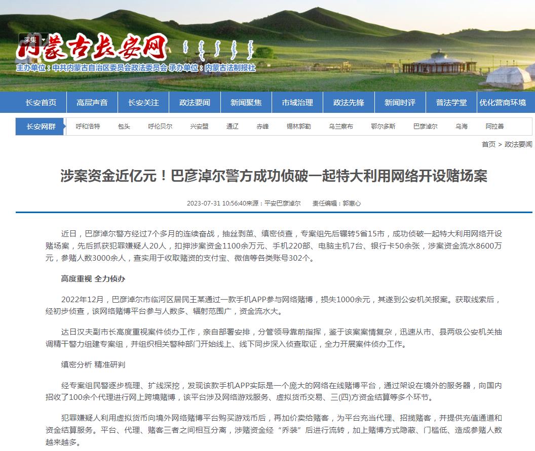 2022年12月,巴彦淖尔市临河区居民王某通过一款手机APP参与网络赌博,损失1000余元,其遂到公安机关报案。获取线索后,经初步侦查,该网络赌博平台参与人数多、辐射范围广,资金流水大。