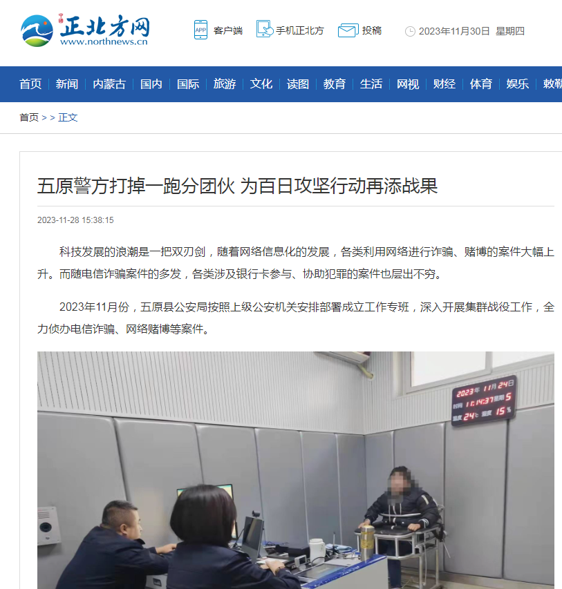 2023年11月份,五原县公安局按照上级公安机关安排部署成立工作专班,深入开展集群战役工作,全力侦办电信诈骗、网络赌博等案件。