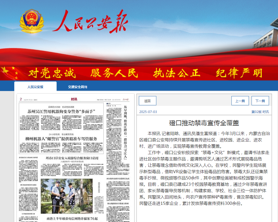 工作中,磴口公安积极探索“禁毒+文化”新模式,邀请书法家走进社区创作禁毒主题作品,邀请剪纸艺人通过艺术形式展现毒品危害,让禁毒理念借助传统文化深入人心。在学校,民警向学生现场展示新型毒品,借助VR设备让学生体验毒品的危害。禁毒大队还征集禁毒手抄报、微视频等作品50余件,其中创意绘画被制成校园警示海报。目前,磴口县已建成23个校园禁毒教育基地,通过少年禁毒宣讲团、家长禁毒督导员等机制,构建家庭、学校、社会三位一体防护体系。民警深入田间地头,向农户宣传禁种铲毒宣传,普及禁毒知识。民警还走进15家企业,累计发放禁毒宣传资料300余份。