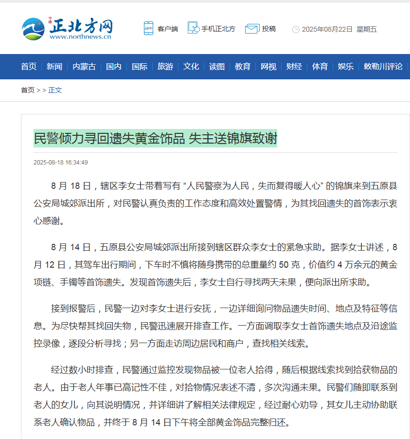 8 月 14 日,五原县公安局城郊派出所接到辖区群众李女士的紧急求助。据李女士讲述,8 月 12 日,其驾车出行期间,下车时不慎将随身携带的总重量约 50 克,价值约 4 万余元的黄金项链、手镯等首饰遗失。发现首饰遗失后,李女士自行寻找两天未果,便向派出所求助。