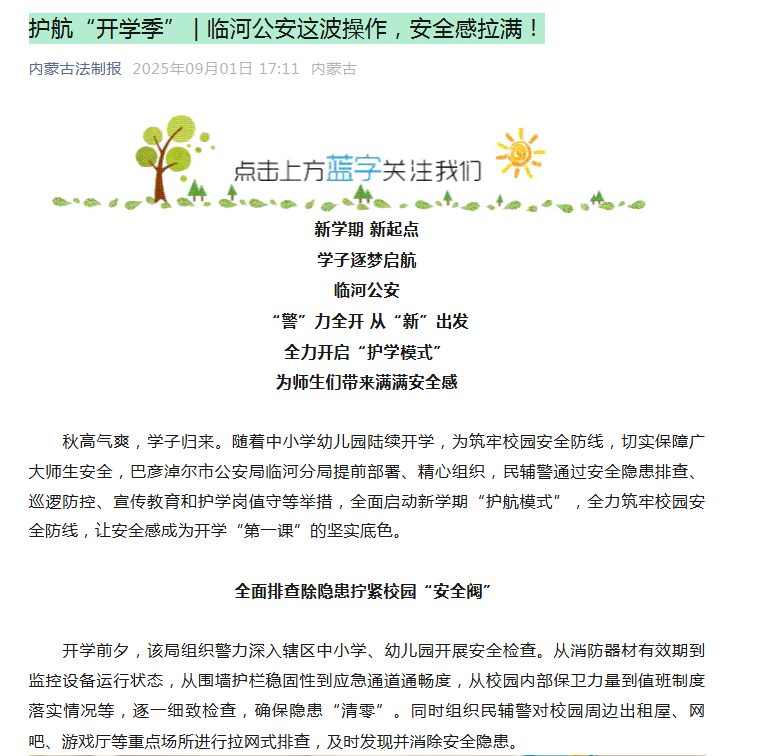 秋高气爽,学子归来。随着中小学幼儿园陆续开学,为筑牢校园安全防线,切实保障广大师生安全,巴彦淖尔市公安局临河分局提前部署、精心组织,民辅警通过安全隐患排查、巡逻防控、宣传教育和护学岗值守等举措,全面启动新学期“护航模式”,全力筑牢校园安全防线,让安全感成为开学“第一课”的坚实底色。