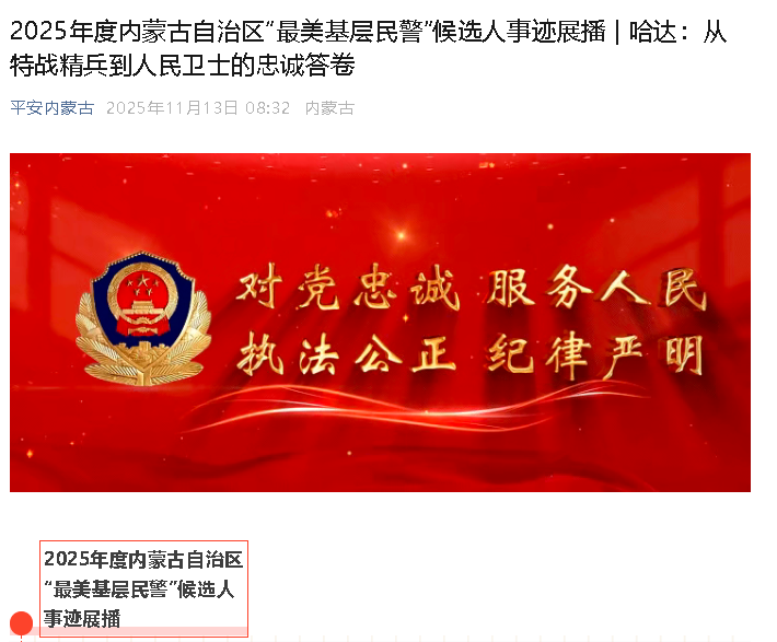 从军营到警营,改变的是身份,不变的是忠诚与担当。哈达的从警生涯证明:真正的英雄从不是天生无畏,而是明知危险仍选择冲锋;真正的坚守从不是豪言壮语,而是把“人民公安为人民”的誓言,融入每一次出警、每一次服务群众的细节之中。