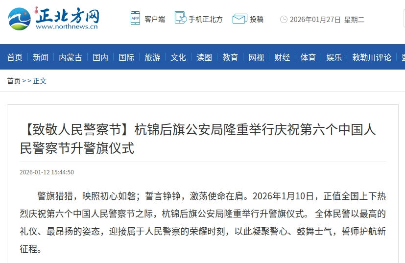 警旗猎猎,映照初心如磐;誓言铮铮,激荡使命在肩。2026年1月10日,正值全国上下热烈庆祝第六个中国人民警察节之际,杭锦后旗公安局隆重举行升警旗仪式。 全体民警以最高的礼仪、最昂扬的姿态,迎接属于人民警察的荣耀时刻,以此凝聚警心、鼓舞士气,誓师护航新征程。
