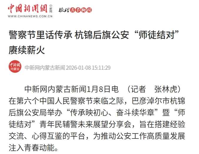 中新网内蒙古新闻1月8日电 (记者 张林虎)在第六个中国人民警察节来临之际,巴彦淖尔市杭锦后旗公安局举办“传承映初心、奋斗续华章”暨“师徒结对”青年民辅警未来展望分享会,旨在搭建经验交流、心得互鉴的平台,为推动公安工作高质量发展注入青春动能。