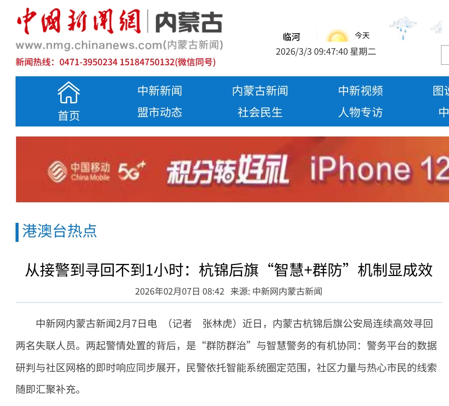 中新网内蒙古新闻2月7日电 (记者 张林虎)近日,内蒙古杭锦后旗公安局连续高效寻回两名失联人员。两起警情处置的背后,是“群防群治”与智慧警务的有机协同:警务平台的数据研判与社区网格的即时响应同步展开,民警依托智能系统圈定范围,社区力量与热心市民的线索随即汇聚补充。