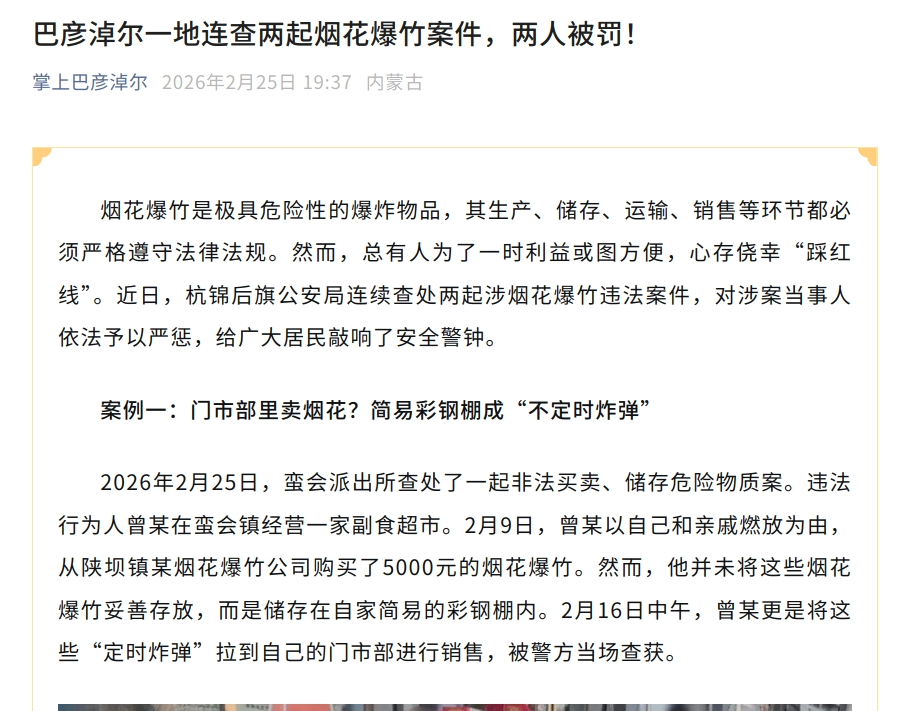 烟花爆竹是极具危险性的爆炸物品,其生产、储存、运输、销售等环节都必须严格遵守法律法规。然而,总有人为了一时利益或图方便,心存侥幸“踩红线”。近日,杭锦后旗公安局连续查处两起涉烟花爆竹违法案件,对涉案当事人依法予以严惩,给广大居民敲响了安全警钟。