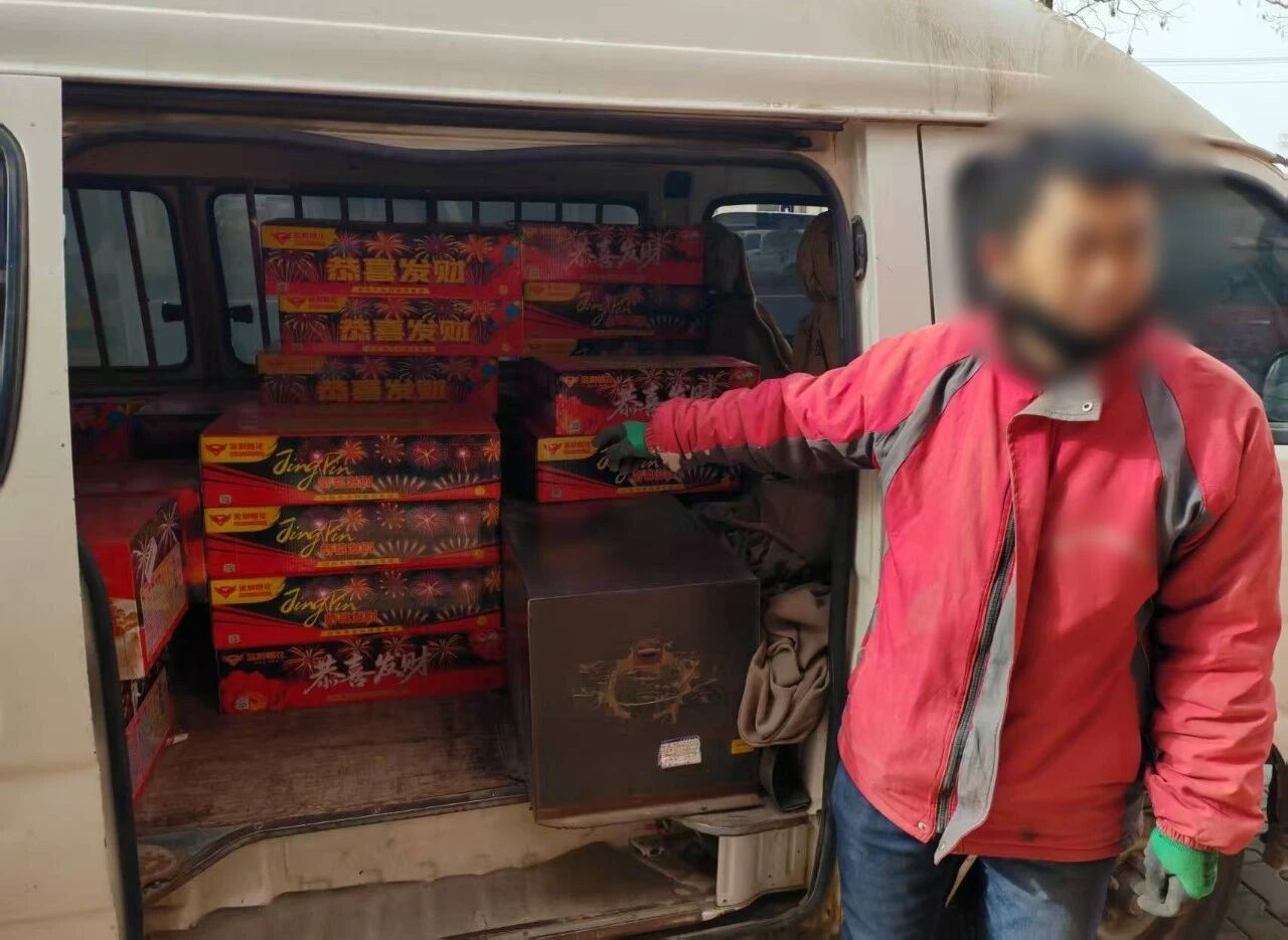 同一天(2月25日),杭锦后旗公安局治安管理大队民警在路面巡查中,发现某烟花爆竹销售店门前停有一辆可疑面包车,经查,属非法运输烟花爆竹车辆。违法行为人蔡某某驾驶装载有烟花爆竹的车辆上路行驶,其车辆不属于运输危爆物品专用车辆,并未按规定悬挂、安装易燃易爆危险物品警示标志。
