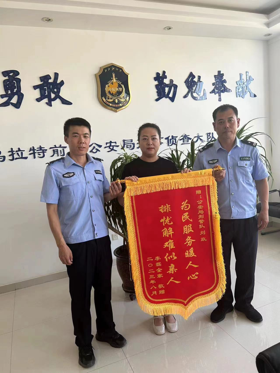 2023年8月18日,乌拉特前旗公安局刑侦大队收到群众李某送来的一面书有“为民服务暖人心,排忧解难似亲人”的锦旗,感谢民警为其找回离家出走的女儿。